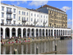 Alsterarkaden, die direkt an der Kleinen Alster liegen und die unterschiedlichsten Geschäfte beherbergen. Hier, an der Kleinen Alster, leben im Sommer die als ein weiteres Hamburger