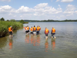 Tom-Sawyer-Teamtour. An einem idyllischen Seeufer starten wir den Tag zunächst mit einem